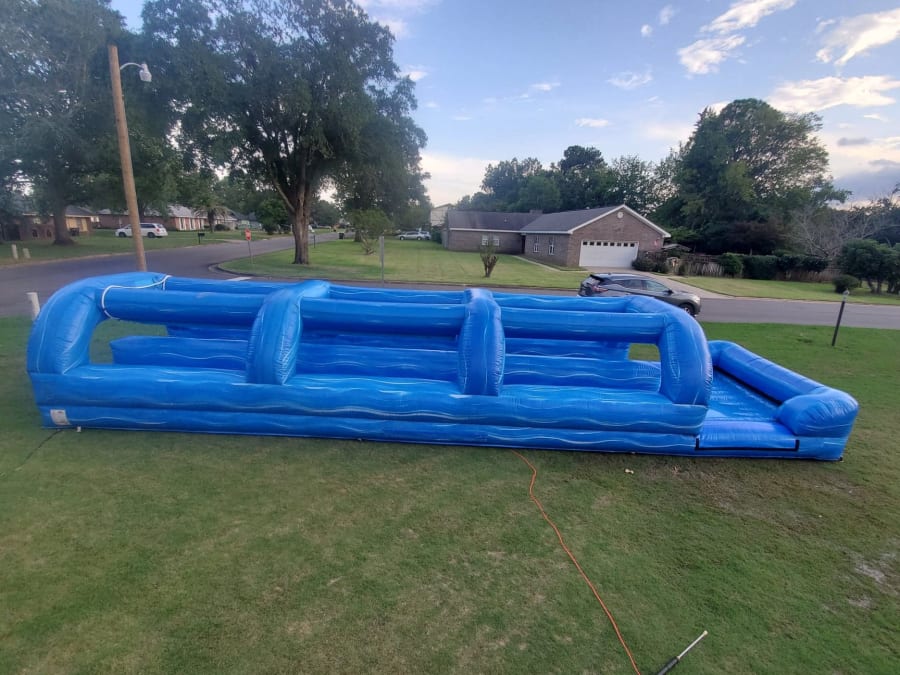 The Slide measures (LWH) 40x15x6 Feet The 40' Long Double Lane Slip and Slide takes 1 blower and needs to be within 75 feet of a dedicated 20amp outlet.