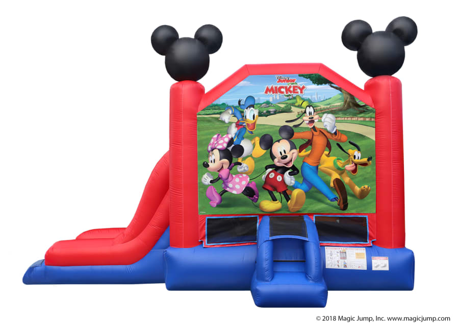 This large bounce house features bright colorful graphics complete with Mouse ears, an inflatable ramp at the entrance, and large netted vent windows to keep things cool for the kids and allow parents to keep an eye on all activities.