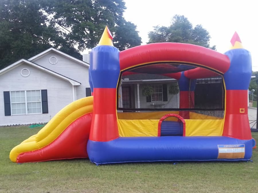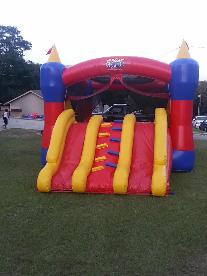 This huge Magic Combo measuring in at 15' deep x 10' wide x 8.25' high overall. Commercial Safety Netting and Snap-Shut Door keep kids playing safely. The slide and climbing arrangement allows for both front and inside access, keeping kids playing both on, and around the inflatable.